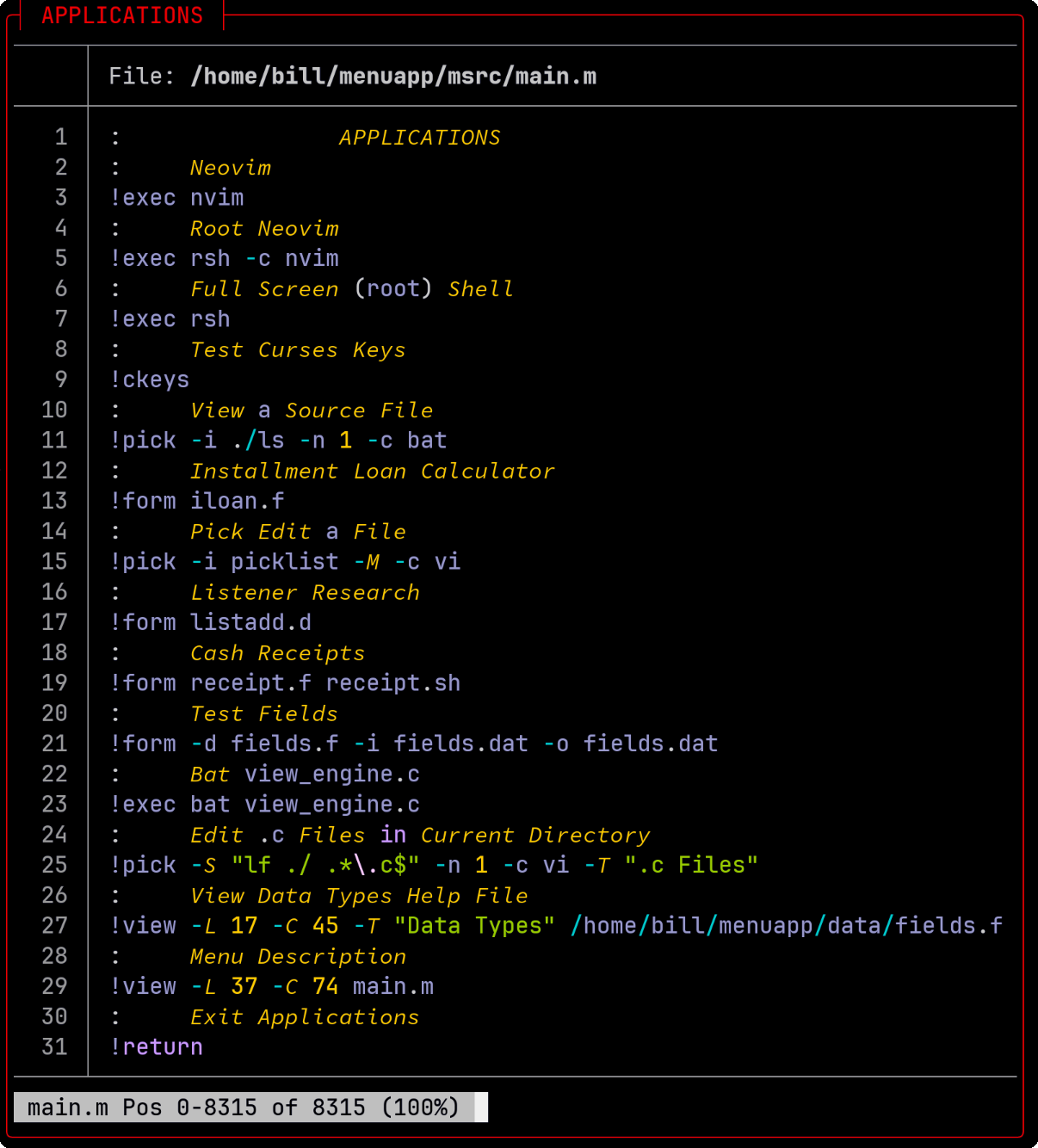 This will launch the C-Menu interface, where you can navigate through the menu items and execute commands as needed. You can also specify a menu description file to use with the -d option: